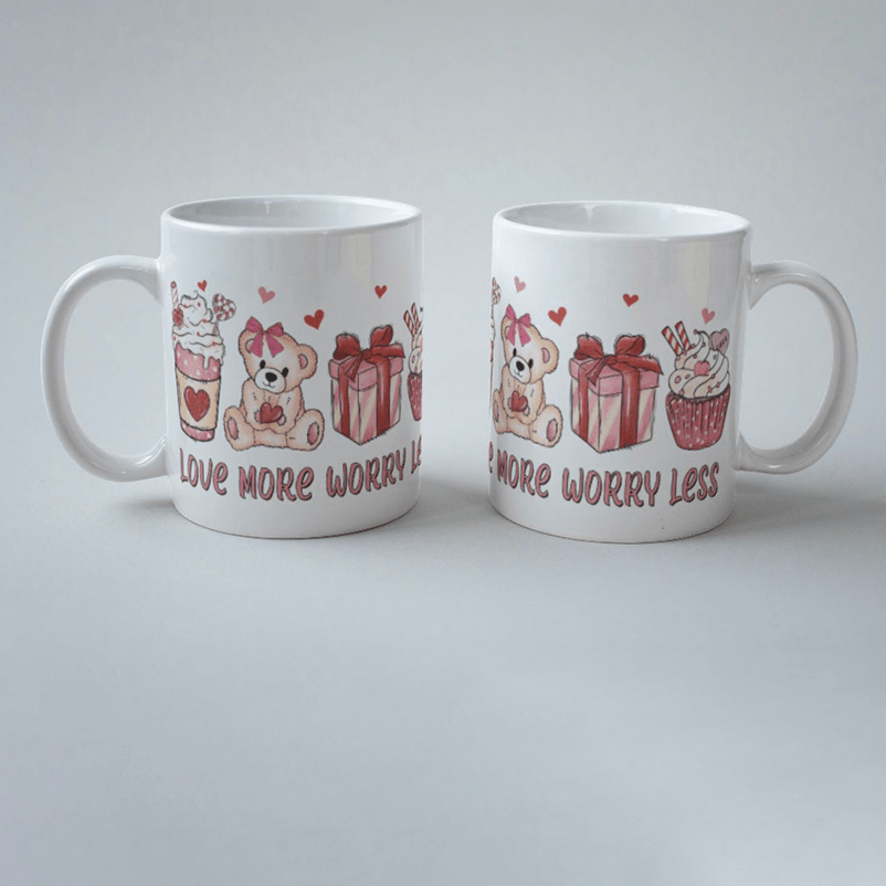 Onze valentijn “Love more worry Less” keramische beker, met een inhoud van 320 ml en een hoogte van 80 mm.