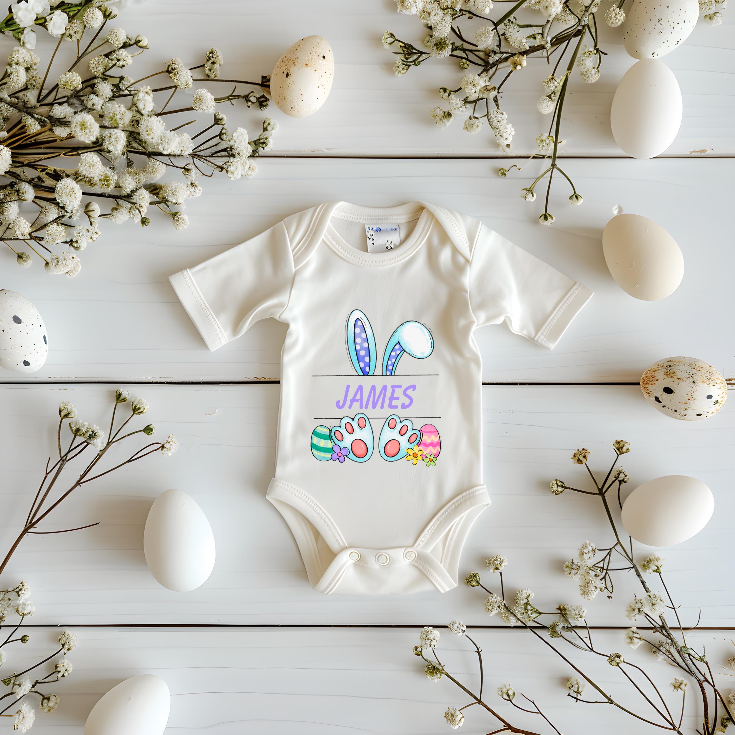 Stap in de wereld van betovering en viering van pasen met je kleintje in stijl! Onze romper, bedrukt in levendige full-color pracht, viert dit speciale seizoen met een vleugje persoonlijkheid.