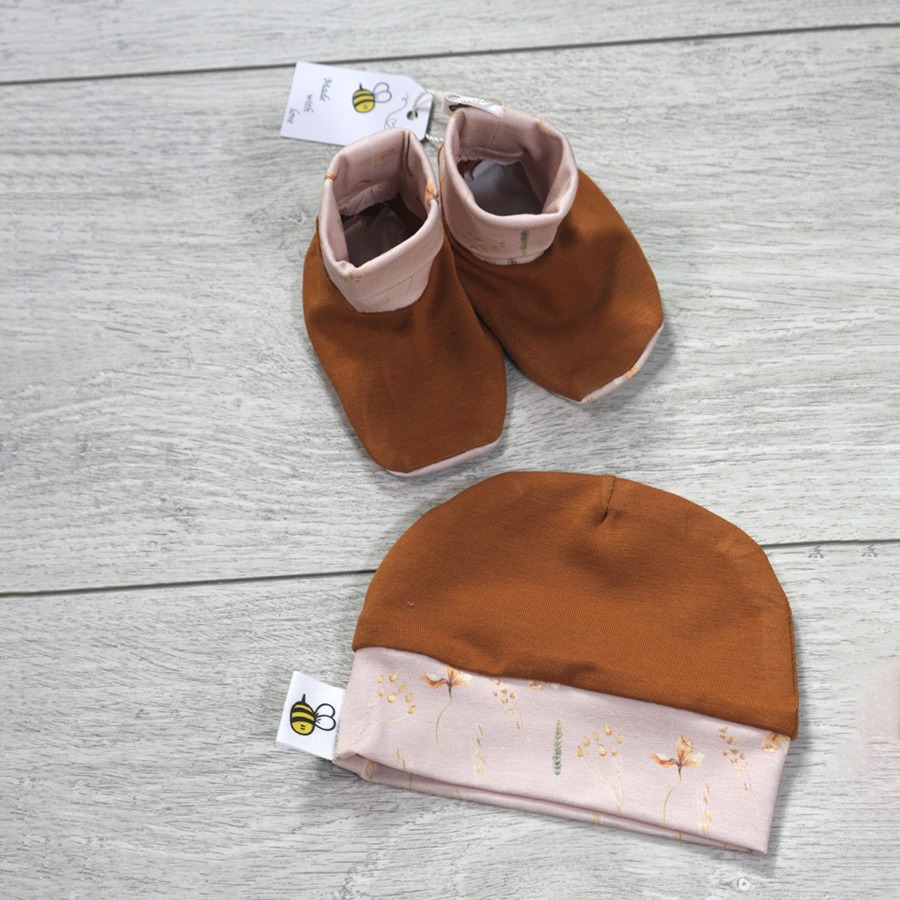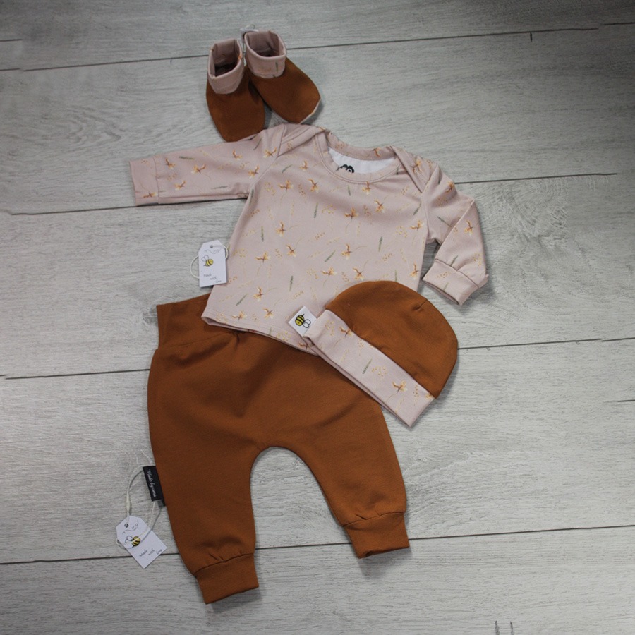 Lieflijk broekje, truitje, mutsje en slofjes. Gemaakt van fijne tricot-stof,
