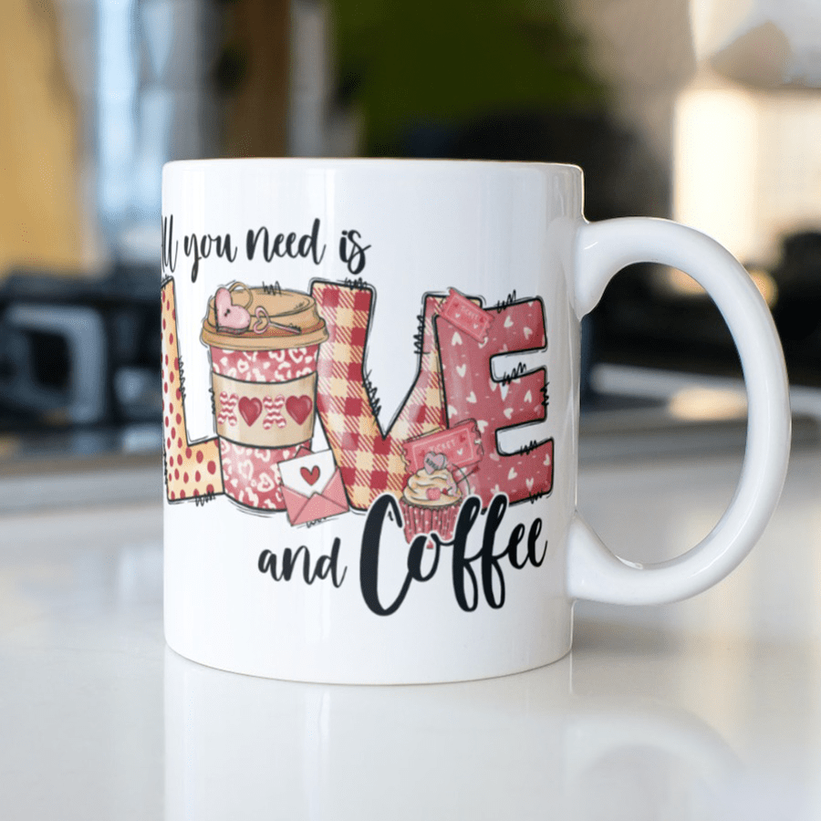 Onze Valentijn “All you need is Coffee” keramische beker, met een inhoud van 320 ml en een hoogte van 80 mm.
